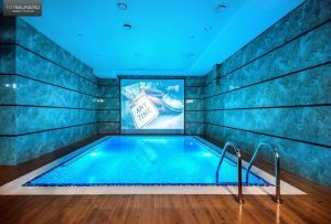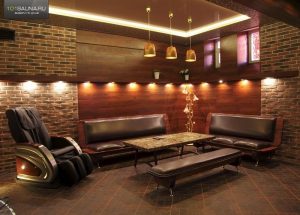 - Зона отдыха с особым стилем – вам покажется, что находитесь в океанариуме, поскольку есть большой аквариум, который погрузит вас в атмосферу подводного царства. Также имеется парная, кедровая бочка для двоих, джакузи с гидромассажем.